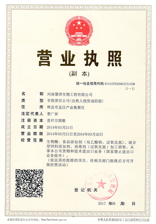 鄭州慧澤生化科技有限公司是一家充滿朝氣的科研生產(chǎn)型高技術(shù)企業(yè)。目前公司業(yè)務(wù)主要集中在精細(xì)化工、食品化工和微生物制劑行業(yè)。公司現(xiàn)已建成鄭州、焦作、新鄉(xiāng)三個(gè)生產(chǎn)基地,其中河南新鄉(xiāng)輝縣孟莊生產(chǎn)基地占地70畝,總投資達(dá)1.2億。現(xiàn)擁有年產(chǎn)100000噸過氧化氫消毒劑,年產(chǎn)8000噸的過氧化鈣和年產(chǎn)5000噸的雙乙酸鈉的生產(chǎn)線,同時(shí)開設(shè)有生產(chǎn)總量5000噸的枯草芽孢桿菌、地衣芽孢桿菌等微生態(tài)制劑發(fā)酵生產(chǎn)車間。公司始終堅(jiān)持“以人為本,科技興企,品質(zhì)優(yōu)良,用戶滿意”的經(jīng)營宗旨。為客戶創(chuàng)造價(jià)值更多的價(jià)值...